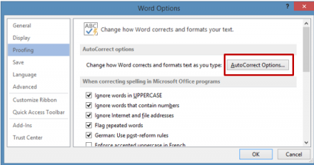 You are probably familiar with MS Office’s AutoCorrect feature.  This is the feature that automatically corrects simple typos and common misspellings.  For example, ‘teh’ changes to ‘the’ as soon as the space bar is hit.  If it does not, then you probably do not have this feature enabled.  You can find the AutoCorrect screen by going to FileOptions→Proofing Menu ItemAutoCorrect Button.