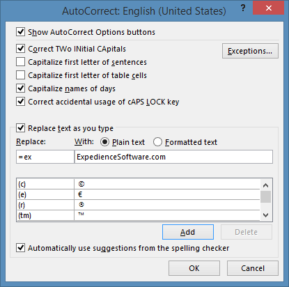 For instance the name of my company, –‘ExpedienceSoftware,’ is quite long making it tiresome every time I need to type it, which is fairly often.  I have added an AutoCorrect item to automate that task for me: To do this, select the desired replacement text:  and open the AutoCorrect dialog box: